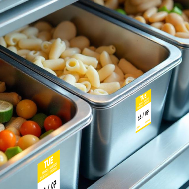 Unverzichtbar in der Lebensmittel- und Gastronomiebranche, wenn es um Hygiene, Qualitätssicherung, Lagerhaltung und Lebensmittelsicherheit geht: eine effiziente und klare Beschriftung mit Tages-Etiketten. Ob Gastronomiebetrieb, Hotel, Bäckerei, Großküche & Kantine, Direktvermarkter auf Wochenmärkten oder Lebensmittelindustrie, die Tages-Etiketten mit Wochentag erleichtern Ihnen und Ihren Mitarbeitern die Nachverfolgung von Verbrauchs-, Herstellungs- oder Öffnungsdaten von Lebensmitteln. Dank eines Farbcodes pro Tag erkennen die Teams auf einen Blick, welche Produkte vorrangig verwendet werden müssen. Dies trägt dazu bei, Lebensmittelabfälle zu reduzieren und eine optimale Rotation der Lebensmittel zu gewährleisten. Die Verwendung von Tages-Etiketten bedeutet eine tägliche Zeitersparnis bei gleichzeitiger Gewährleistung einer einwandfreien Servicequalität im Rahmen des HACCP-Standards und lässt sich perfekt in die Arbeitsabläufe Ihrer Küche oder Produktion integrieren. Die Papier-Etiketten sind einfach und schnell mit jedem beliebigen Stift beschreibbar, einfach Datum und/oder Inhalt aufschreiben. Die Etiketten haften zuverlässig auf den verschiedensten Oberflächen, nach Verwendung können die Etiketten dank des ablösbaren Spezialklebstoffs ohne Rückstände abgezogen werden - ideal zur hygienischen Reinigung. Die jeweilige Wochentag-Beschriftung wird auf Deutsch, Englisch, Französisch, Italienisch und Niederländisch angegeben. Dank der praktischen, stabilen Spenderbox können die Etiketten auf Rolle schnell und einfach entnommen und sauber aufbewahrt werden. Die Tages-Etiketten aus Papier sind für den indirekten Kontakt mit Lebensmitteln geeignet. Die Lebensmittel-Kennzeichnung ist gesetzlich durch die EU-Verordnung (EG) Nr. 852/2004 und der LMHV (Lebensmittelhygieneverordnung) geregelt: Unternehmen und Betriebe, die mit leicht verderblichen Lebensmitteln umgehen oder Lebensmittel herstellen, müssen ein Hygienekonzept (HACCP) umsetzen und dokumentieren. Unsere Tages-Etiketten für Lebensmittel helfen Ihnen, in Ihrem Betrieb die strengen Hygiene- und Qualitätsstandards einzuhalten - und das effizient, klar ersichtlich und ohne großen Aufwand.