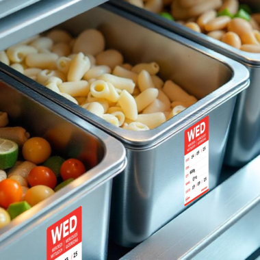 Unverzichtbar in der Lebensmittel- und Gastronomiebranche, wenn es um Hygiene, Qualitätssicherung, Lagerhaltung und Lebensmittelsicherheit geht: eine effiziente und klare Beschriftung mit Tages-Etiketten. Ob Gastronomiebetrieb, Hotel, Bäckerei, Großküche & Kantine, Direktvermarkter auf Wochenmärkten oder Lebensmittelindustrie, die Tages-Etiketten mit Wochentag erleichtern Ihnen und Ihren Mitarbeitern die Nachverfolgung von Herstellungs-, Verbrauchs- oder Verfalldaten sowie von Produktdaten von Lebensmitteln. Dank eines Farbcodes pro Tag erkennen die Teams auf einen Blick, welche Produkte vorrangig verwendet werden müssen. Dies trägt dazu bei, Lebensmittelabfälle zu reduzieren und eine optimale Rotation der Lebensmittel zu gewährleisten. Die Verwendung von Tages-Etiketten bedeutet eine tägliche Zeitersparnis bei gleichzeitiger Gewährleistung einer einwandfreien Servicequalität im Rahmen des HACCP-Standards, die Etiketten lassen sich perfekt in die Arbeitsabläufe Ihrer Küche oder Produktion integrieren. Die Papier-Etiketten sind einfach und schnell mit jedem beliebigen Stift beschreibbar, es stehen mehrere Textfelder zur Verfügung: Date/Datum, Item/Produkt, QTY/Menge, Name, Use by/Verwendung bis. Die Etiketten haften zuverlässig auf den verschiedensten Oberflächen, nach Verwendung können die Etiketten dank des ablösbaren Spezialklebstoffs ohne Rückstände abgezogen werden - ideal zur hygienischen Reinigung. Die jeweilige Wochentag-Beschriftung wird auf Englisch, Französisch, Deutsch, Italienisch und Niederländisch angegeben. Dank der praktischen, stabilen Spenderbox können die Etiketten auf Rolle schnell und einfach entnommen und sauber aufbewahrt werden. Die Tages-Etiketten aus Papier sind für den indirekten Kontakt mit Lebensmitteln geeignet. Die Lebensmittel-Kennzeichnung ist gesetzlich durch die EU-Verordnung (EG) Nr. 852/2004 und der LMHV (Lebensmittelhygieneverordnung) geregelt: Unternehmen und Betriebe, die mit leicht verderblichen Lebensmitteln umgehen oder Lebensmittel herstellen, müssen ein Hygienekonzept (HACCP) umsetzen und dokumentieren. Unsere Tages-Etiketten für Lebensmittel helfen Ihnen, in Ihrem Betrieb die strengen Hygiene- und Qualitätsstandards einzuhalten - und das effizient, klar ersichtlich und ohne großen Aufwand.